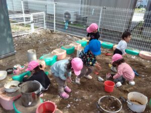 園庭では砂場でおままごと🎵おなべに桜のはなびらを入れてごちそうを作っていました。