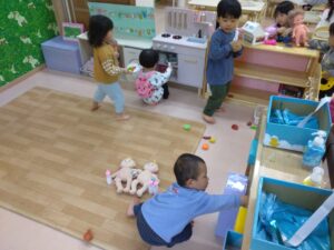 天気のいい日には園庭に出て、雨の日にはお部屋やホールを使って楽しく過ごしています。