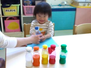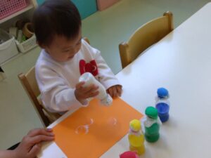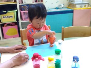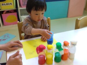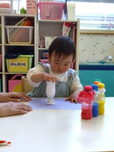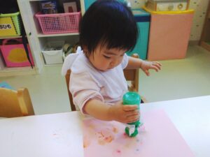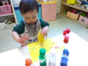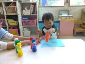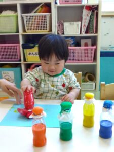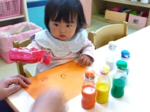 月齢の小さい子も、絵の具の入ったボトルを興味津々に手に取り