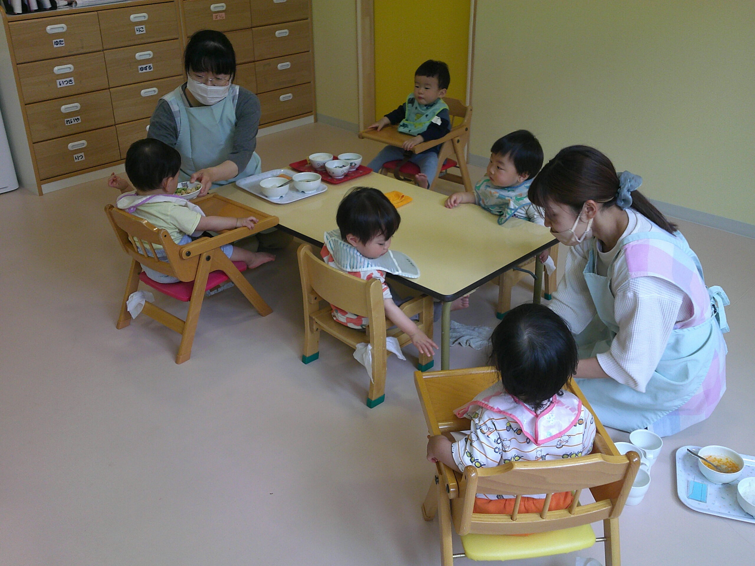 まだ先生たちのお手伝いが必要な月齢ですので、先生から食べさせてもらい「もっともっと」とアピールする子どもたち。