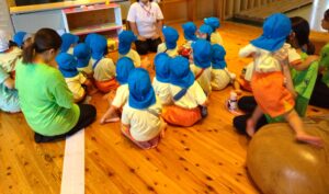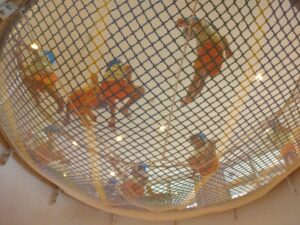 大きなネットに乗って下をのぞき込んで「おーい!せんせーい!見えるー?」と満足そう。一部怖がっていた子はいましたが、果敢にネットに飛び込んでいく子どもたちでした(笑)
