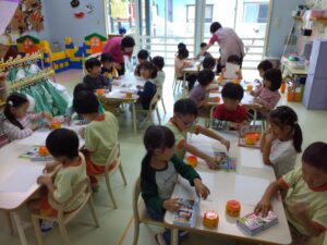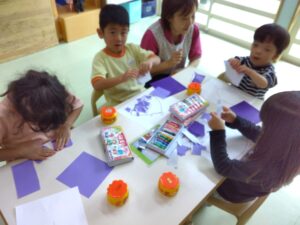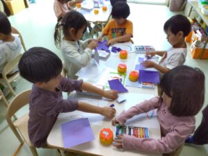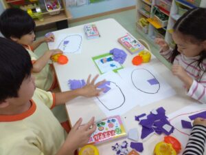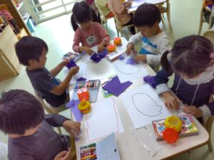 「どんな形だったかな~」「大きいのだったから大きく描く!」と昨日のことを思い出しながら楽しそうに作っていました😊