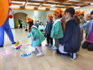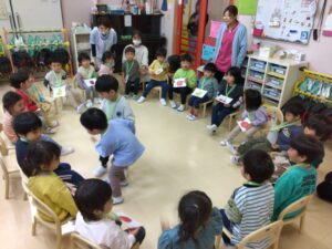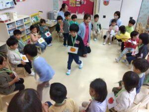 座れなかったお友達は真ん中に立ち、何の果物にしようか考え、大きな声で果物の名前を言ってくれました🤩