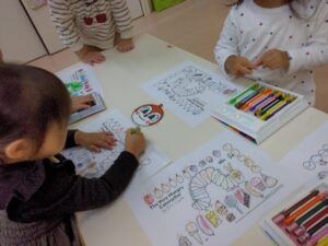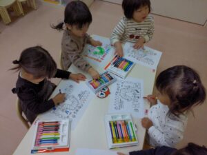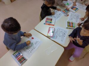 なかには、「♪チョコレートケーキと…」と歌いながらぬりえを楽しむ子もいました🍎