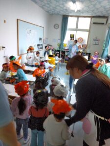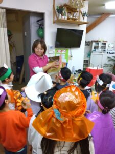 自分たちのかぼちゃバッグにお菓子を入れると、「ママと一緒にたべる」「妹と分け合いっこして食べるね」「美味しく食べるね」と目をきらきらさせ可愛い子どもたちでした✨🤗