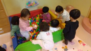 ボールプールを出すと、、みんな興味津々で入っていき、せまい空間も心地いいようで満員御礼でした(笑)