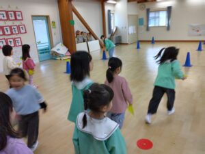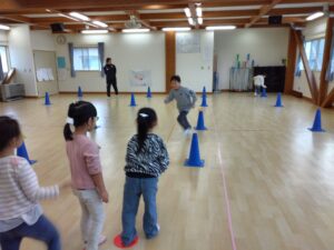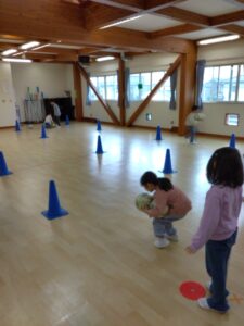 1つめは、サッカーボールを3つ手で抱え並んでいるコーンの間を左右にくねくねと交互に通りながら次のお友だちへとパスをして、先に全員終わったチームが勝ちというものでした。