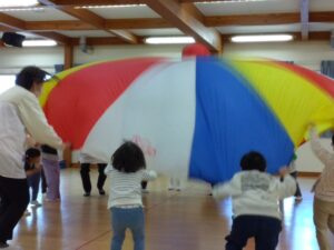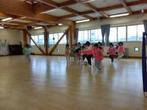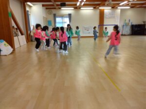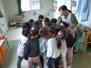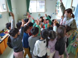 保育者が「強くバサバサするよ~」と声をかけると力の限りバサバサするきりん組の子どもたち(笑)