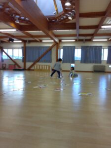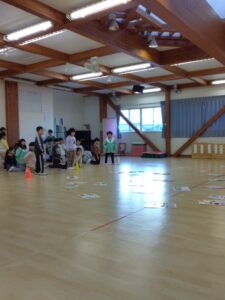 2つ目のゲームは、並んだ4つのコーンの上にマーカーを1枚ずつのせ、最後の一人が戻ってきたらチーム全員で座り、早かったチームが勝ちというものでした。